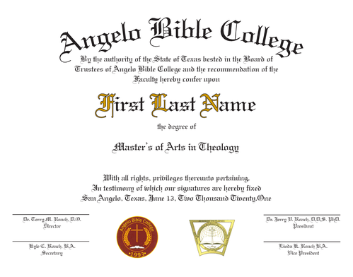 Angelo Bible College is Accredited by the Transworld Accrediting Commission International. Chartered by the State of Texas: Charter Number 126013401.